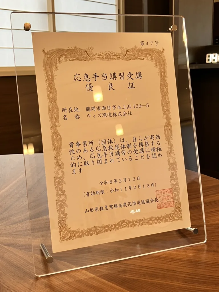 山形県救急業務高度化推進協議会長より「応急手当講習受講優良証」をいただきました事業所に応急手当普及員を設置かつ全従業員数の30%以上が普通救命講習等を受講しているなどの要件を満たす事業所に対して交付されるものです引き続きAEDや普通救命の推進に取り組んでまいります